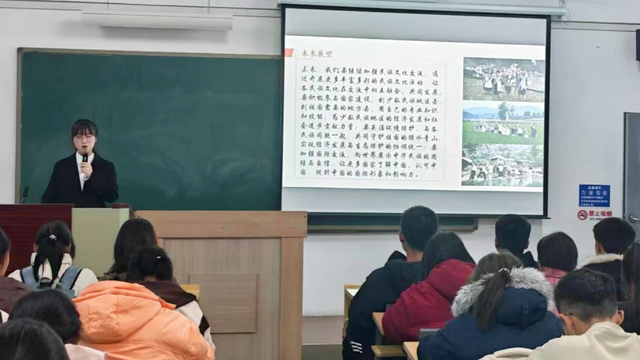 活动伊始,主讲人从历史视角切入,通过史料图片、民族交往典故,系统回顾了从古代民族融合、近代共同抗争到现代民族政策的团结历程。随着分享深入,现场氛围愈发浓厚,同学们专注聆听、不时点头,在鲜活案例中读懂中华民族“多元一体”格局的历史根基,油然而生历史自豪感与文化自信心。紧接着,活动转入核心环节,聚焦“中华民族共同体意识”的八大维度,主讲人结合现实案例层层剖析,用通俗语言阐明各民族“一荣俱荣、一损俱损”的命运关联。现场互动提问环节,讨论声与应答声交织,理论解读更具感染力。随后的“认同感培养”与“使命感激发”环节,大家结合自身见闻分享对民族团结的理解,有人提及日常与不同民族同学相处的点滴,有人谈到参与民族文化宣传活动的体会,交流中不时传来认同的附和声,在真诚沟通中筑牢“石榴籽”般的团结情怀。活动尾声,主讲人发出行动号召,鼓励同学们通过参与社会实践、文化交流等具体行动践行初心。现场同学纷纷表示,此次活动内容扎实、案例鲜活,既深化了对共同体意识的理解,更明确了自身责任,今后将主动把民族团结理念融入日常,做共同体意识的践行者、民族团结的维护者。