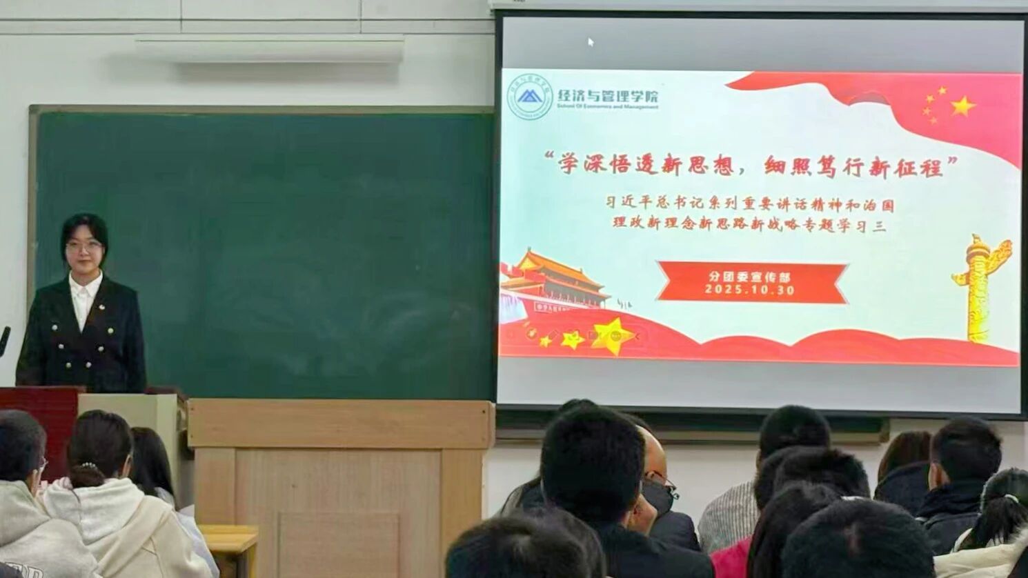 为引导青年学子将习近平新时代中国特色社会主义思想转化为投身中国式现代化建设的实践动能,10月30日,经济与管理学院于土木教学馆B406开展“学深悟透新思想 细照笃行新征程”——习近平总书记系列重要讲话精神和治国理政新理念新思想新战略专题学习(三)活动。